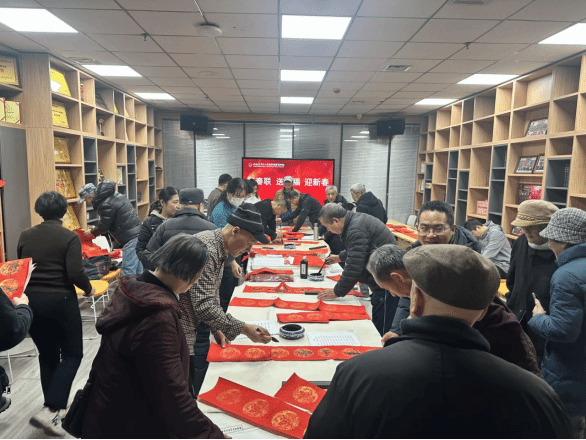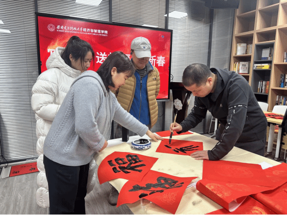 同一时间,在经管院“职工小家”,公司工会打造的“写春联、送祝福、迎新春”活动也进行着。活动现场墨香四溢、年味渐浓,一片喜庆祥和的气氛扑面而来。书法家们挥毫泼墨,通过春联这一载体把“福气”跃然于纸上。公司师生陆续来到现场,精挑细选春联、寄托对新年的美好期待。