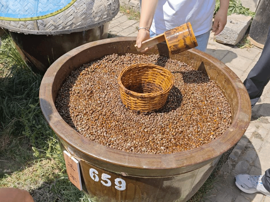 调研首站,师生们来到孙镇阿坡酱油厂。在阿坡酱油负责人杜丽君的引导下,大家深入参观酱油发酵工艺流程。一排排巨大的发酵缸整齐排列,空气中弥漫着醇厚的酱香,古老与现代交融的酿造技艺令人赞叹。师生们手持竹制打油器,从发酵缸中舀取新鲜酱油,感受传统打酱油的趣味。