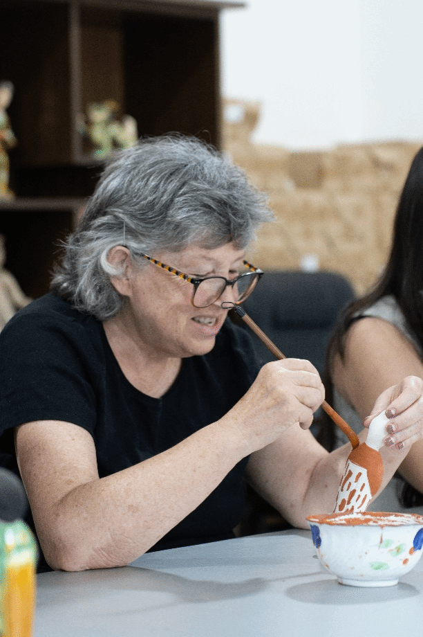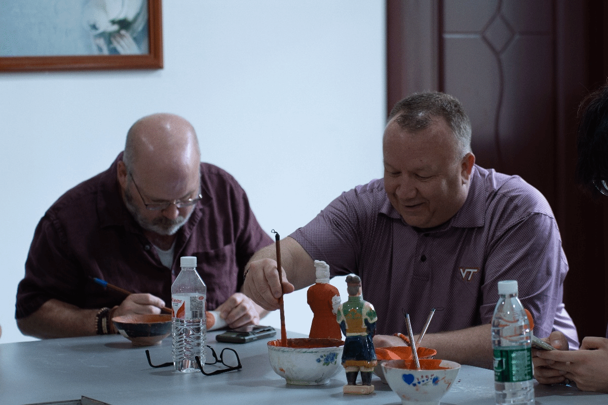 参观结束后,大家在李老师的指导下体验唐三彩上釉技艺。从精准调色到细腻描线,再到灵动点彩…… 这些看似简洁的工序背后,实则深蕴传统手工艺人的匠心哲思。外籍教师们在操作中感慨道:“这些工序看似直观,但釉料在陶坯上流动的轨迹充满不确定性,每一次着色都需要耐心把控。” 在活动中,中外师生们也都积极参与,各自展开想象去上釉,看着凝结着自己巧思的作品,眼中闪烁着对传统工艺的赞叹与不舍。这些承载着东方美学密码的手作成果,既是此次文化之旅的珍贵纪念,更是中外文化交流的生动印记, 它们将带着非遗技艺的独特魅力走向世界,在不同文明的土壤里播撒下共鸣与欣赏的种子,让跨越千年的唐三彩艺术,在新时代的文化对话中绽放出更璀璨的光彩。