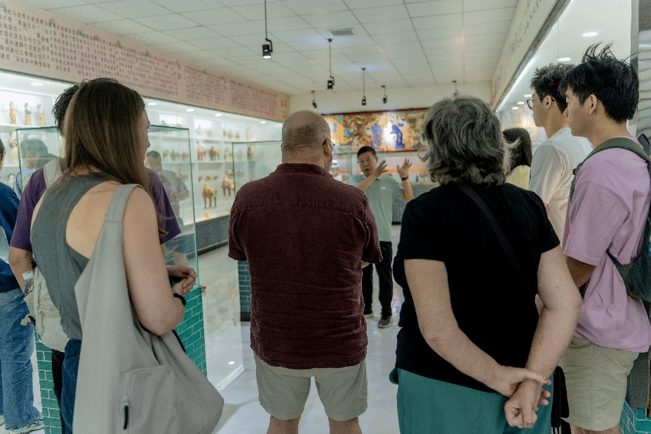 上午,师生团队抵达西安市非物质文化遗产唐三彩烧制技艺保护传习所。技艺传承人李建鹏老师热情接待并讲解,他从唐三彩的历史渊源、工艺演变到其在丝绸之路上的文化交流作用,娓娓道来。展览馆内,驼队陶俑、仕女俑等文物生动还原了古代商旅往来长安的盛景;现代创新作品则展现了非遗技艺在当代设计中的巧妙融合。外籍教师们驻足于“丝绸之路主题展区”,通过一件件釉色斑斓的陶器,直观感受到唐代对外开放的辉煌历史,不停发出感叹。
