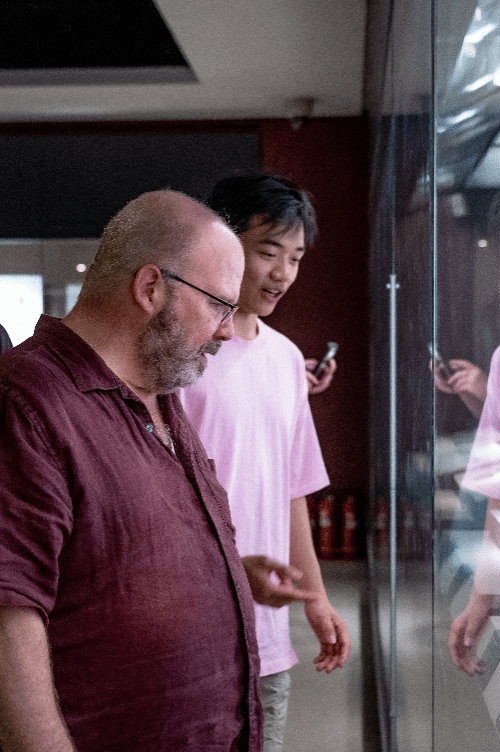 “唐代长安不仅是经济中心,更是文明互鉴的枢纽。”中美项目2024级员工闫俞向指着“铜铸长安城遗址”壁画介绍道。闫俞向长期担任大唐西市博物馆双语讲解志愿者,他从馆藏的开元通宝、鎏金工艺品到复原的“西市街巷”,以中英文结合的方式为大家解读了丝路贸易与文化交融的历史细节。