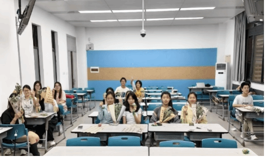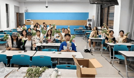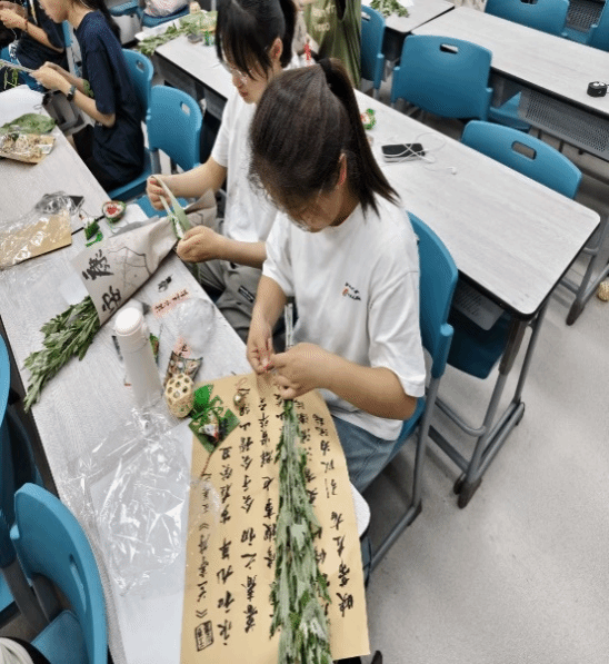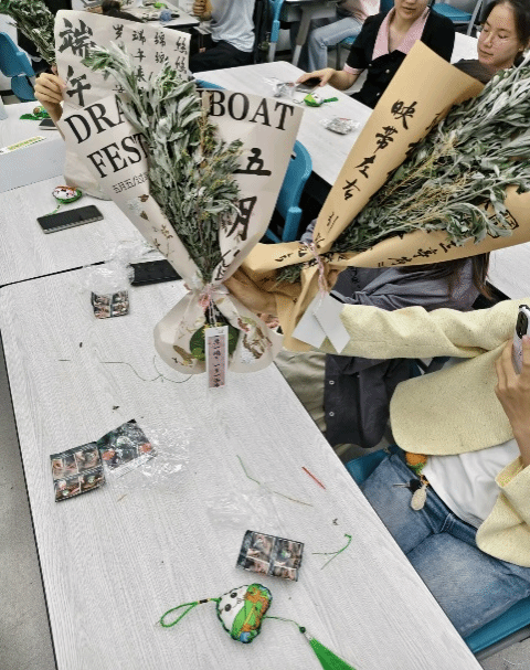 最后,进入“艾草传意”艾草花束制作环节。新鲜的艾草与菖蒲散发着独特的清香,搭配上五彩丝线和装饰花材,在同学们的巧手下,变成了一束束充满创意与温情的艾草花束。大家手持亲手制作的花束,脸上洋溢着幸福的笑容,纷纷表示要将这份饱含端午气息的祝福带回家中,祈愿家人平安健康。