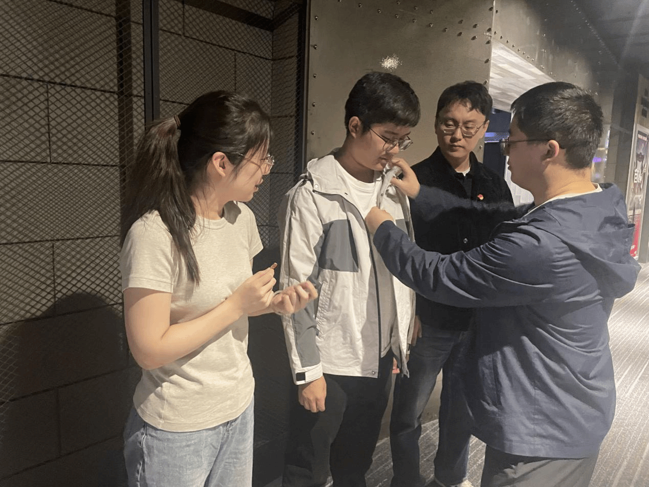 电影放映结束后,一场兼具庄重感与仪式感的党徽佩戴仪式随即举行。即将毕业离校的支部宣传委员叶进同志,作为党员代表为支部王玉龙、包强、雷俊婵3名预备党员赠送并佩戴党员徽章。“党徽是党的象征,更是责任的标志,希望你们时刻以党员标准严格要求自己,让党徽在岗位上闪光。”叶进同志一边细心调整党徽位置,确保其端正地佩戴在每位新党员左胸中间的醒目处,一边轻声嘱托。面对鲜红的党徽,3名新党员挺直脊梁,脸上洋溢着加入党组织的自豪,眼中闪烁着践行初心使命的坚定光芒——这一时刻,不仅是党员身份的正式确认,更是红色基因的代际传递,是“开创未来”的使命交接。