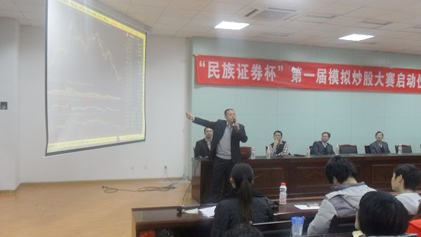 经济管理公司党委副书记李勇强首先介绍了本届大赛的组织情况,他指出本次大赛旨在普及证券知识,增强在校老员工对资本市场的认识,希望参赛同学能够在此次比赛中了解证券市场运作规律,锻炼同学们的实际操作能力,并借此关注社会热点,把握经济动态,培养正确的投资理念和敏锐的市场洞察力。随后,中国民族证券西安营业部高级投资顾问罗敏女士介绍了证券市场和股票操作的一些基本理论,并就参赛同学参赛期间所应注意的相关事宜进行了详细的讲解。中国民族证券西安营业部总经理周光宇先生随后致辞,他介绍了民族证券公司的相关情况,并就老员工如何成为一名优秀的证券行业从业人员,提出了希望和建议,最后他指出模拟炒股大赛是结合现代投资理财的需要,具有实践性和趣味性,是一次考验理财智慧,激发职场潜能的比拼,也是一次考验心理素质,直面盈亏的大赛,并预祝所有参赛选手赛出好成绩。最后,校团委校团委副书记朱文凯宣布英国365集团公司“民族证券杯”第一届模拟炒股大赛正式启动。