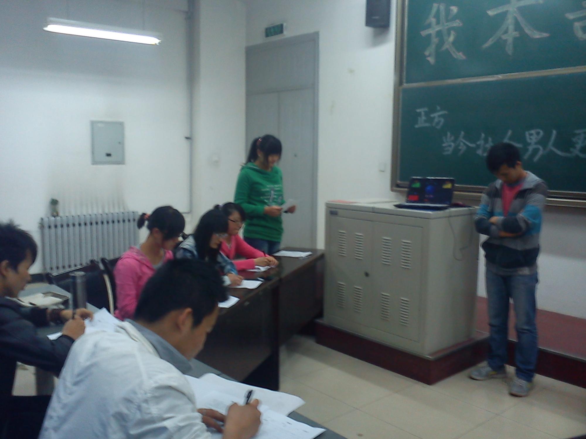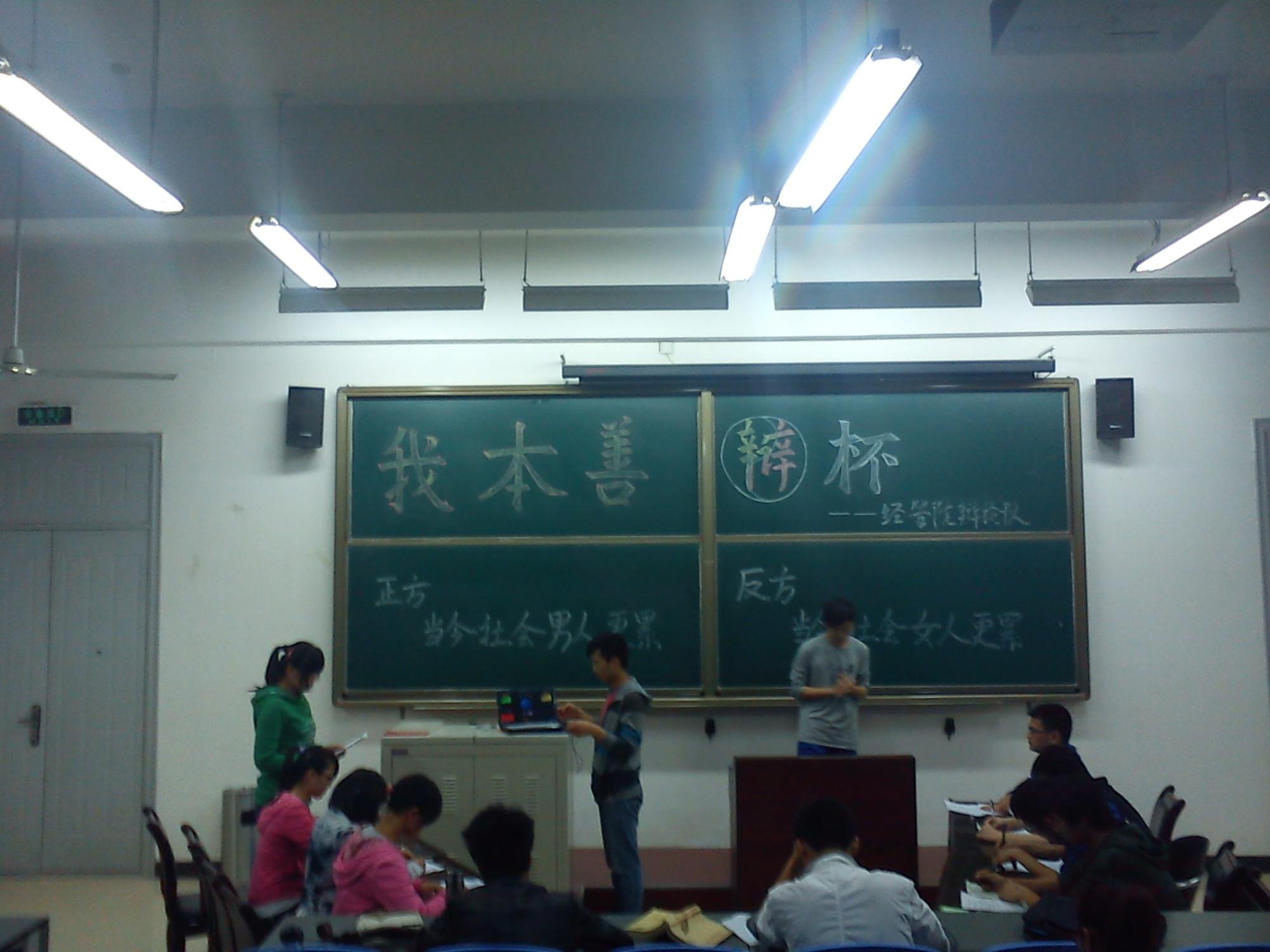 2012年4月11日星期三,晚七点半,由经济管理公司辩论队与2011级各宿舍联合举办的“第九届我本善辩杯”辩论赛复赛第一场正式开赛,此次辩论赛在B421举行,到场的评委是经管院2010级员工段亚强、卓德义、袁雪艳。本次辩题是“当今社会,男人更累还是女人更累”,正方辩手是504宿舍的董晨露、聂耀男、王蕾、龚敏同学,她们的观点是“男人更累”,反方辩手是201宿舍的王鹏、范云涛、梁磊、王和全同学,他们的观点是“女人更累”。