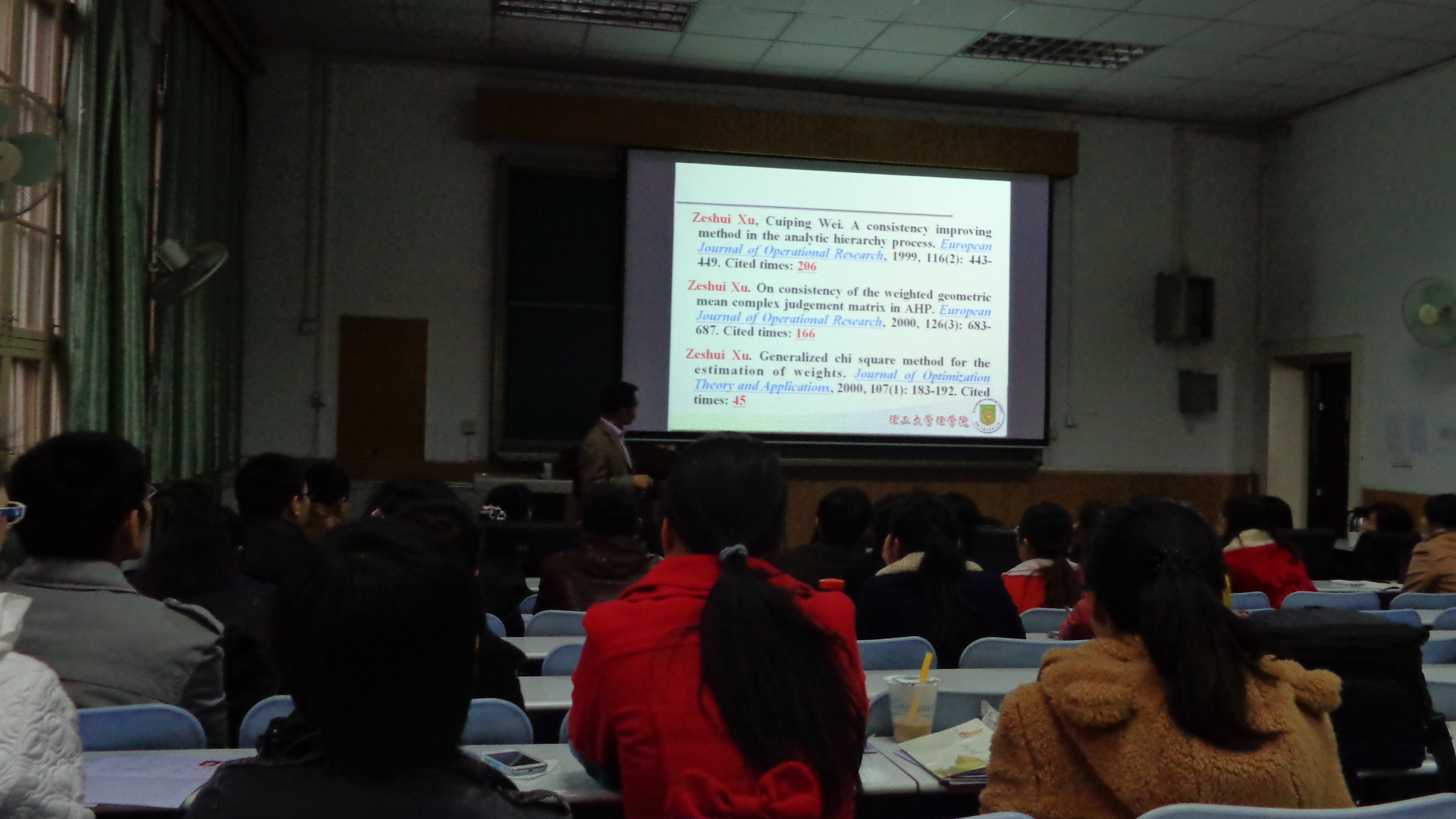 报告中,徐泽水教授以自身发展经历为主线,向在座的师生介绍了自己在硕士、博士、博士后及后续研究过程中的研究内容、研究方法及研究成果。他长期从事决策分析、模糊数学、信息融合等研究,研究主题涉及“判断矩阵排序理论、不确定多属性决策、有序信息集成理论、语言决策理论、直觉模糊决策理论、犹豫模糊决策理论”六个方面研究。结合上述研究内容,他以幽默的语言生动而形象地向师生们阐述了科研选题的技巧与方法以及如何凝练科学研究思路、提升学术素养等。