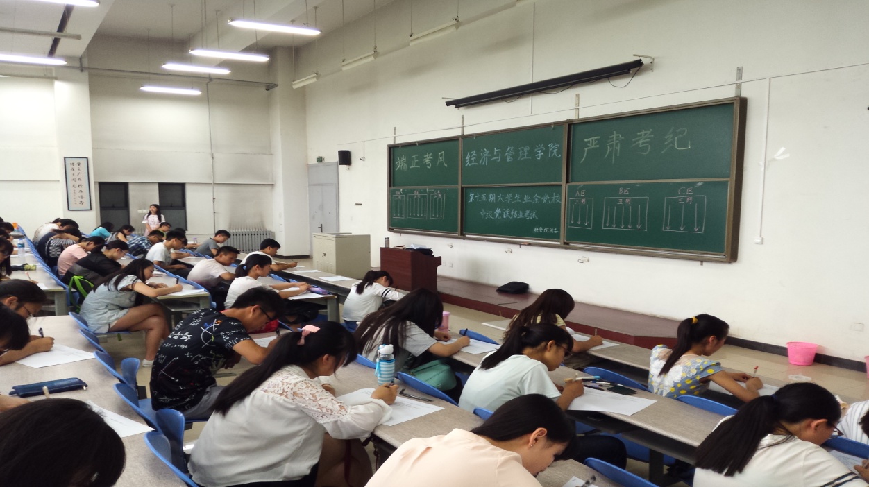 (通讯员:遇萱)经过一周紧张充实课程的学习,新一批老员工入党积极分子于2015年5月17日在B楼537进行中级党课结业考试。此次党课课程及结业考试由经管院团委组织部主办,在部长王雅彤的组织带领和各干事的共同合作下,经管院第十五期老员工业余党校中党课程取得圆满成功。十五期中级党课主要分三讲:樊稳老师的《理想与信念》、王益锋老师的《保持党员先进性》以及刘文博老师的《关于入党与党的基本理论》。党课主题深刻、内容丰富,都给各入党积极分子留下了深刻印象。在此次的中党结业考试中,各成员都怀着无比激动的心情,严肃对待考试过程。在考试的一小时过程中,新一批入党积极分子都认真严谨地完成考试内容,争取向党组织递上一份满意的答卷!
