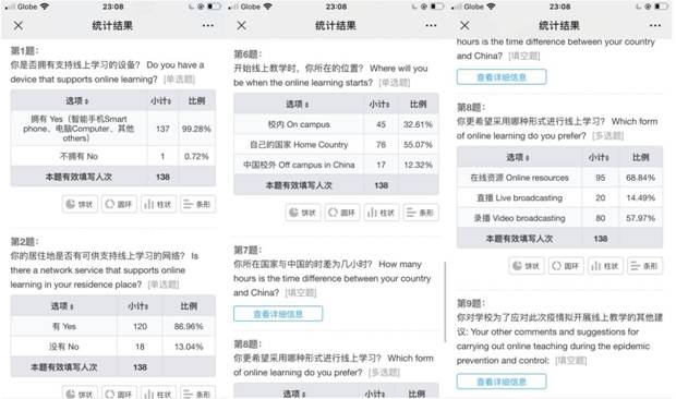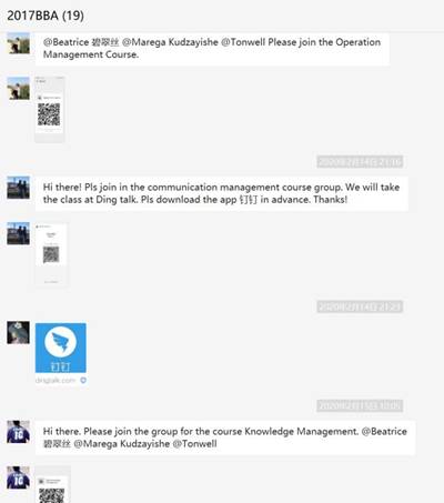 为了能够提前做好在线教学的准备,国际教育公司教务工作人员和辅导员在开学前就已与各公司国际职工密切联系,制作并发放了调查问卷,积极了解其所在国家的网络教学保障环境实况及员工参与线上课程学习的意愿与方式,并组建班级微信群。英国365集团公司负责国际员工教务的工作人员在第一时间发布规范公司国际员工教学的通知,紧锣密鼓地协调各年级课程的任课教师,编排及上线国际班本科生及研究生课程,在任课教师微信群和员工微信群中及时发布课程信息,引导员工和任课教师有序建立联系,实时回复教师和员工的相关平台技术问题,确保线上教学的有序开展和后续的平稳运行。