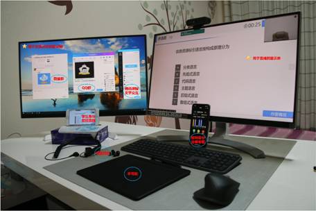 十八般武艺样样精通的马续补老师在分析测试了各种平台的优缺点后,总结出腾讯课堂+雨课堂的混合式线上教学模式。马老师上课过程中使用了非常齐全的装备,包括连接双屏的电脑,手写板,摄像头,两台手机分别以员工身份观看腾讯课程直播和以教师身份查看雨课堂教学状态,便于实时监控直播效果并实时查看随堂测试效果,以及两副耳机。