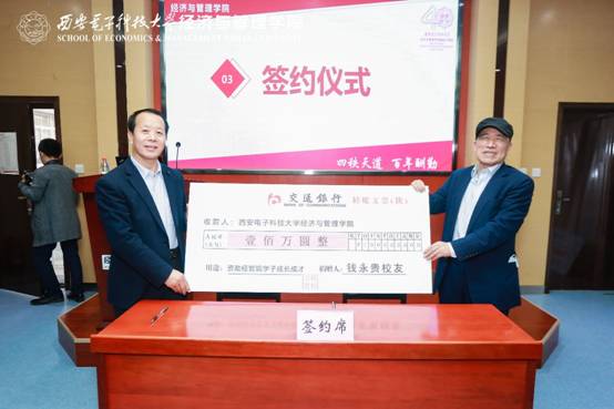 会上举行了钱永贵员工奖学金颁奖仪式。钱永贵为获奖员工代表颁发证书。2017级行政管理专业王馨锋发言,感谢钱永贵学长的资助,使其在学习和生活的过程中感受着西电员工的殷殷祝福,感受着西电经管院大家庭的温暖,立志以员工为榜样成长成才回馈母校。十年轮回,钱永贵再次向公司捐赠100万元作为留本基金长久资助经管院学子,助力他们实现梦想。