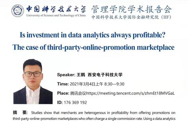 POM是全球各地商公司公认的一流期刊目录UTD24期刊之一,以其在运筹管理领域具有极高的影响力著称,在国际管理学界享有极高的学术声誉。王鹏同学与合作者广泛、深入地研究了第三方在线促销平台的各种佣金抽成策略,创造性地提出了一种基于商家类型的抽成方案,给出了该方案的适用条件,揭示了该方案对商家和消费者的影响机制。该研究成果对在线促销平台创业者的创业、创新具有应用价值,对互联网信息服务产业的发展提供了重要管理启示。