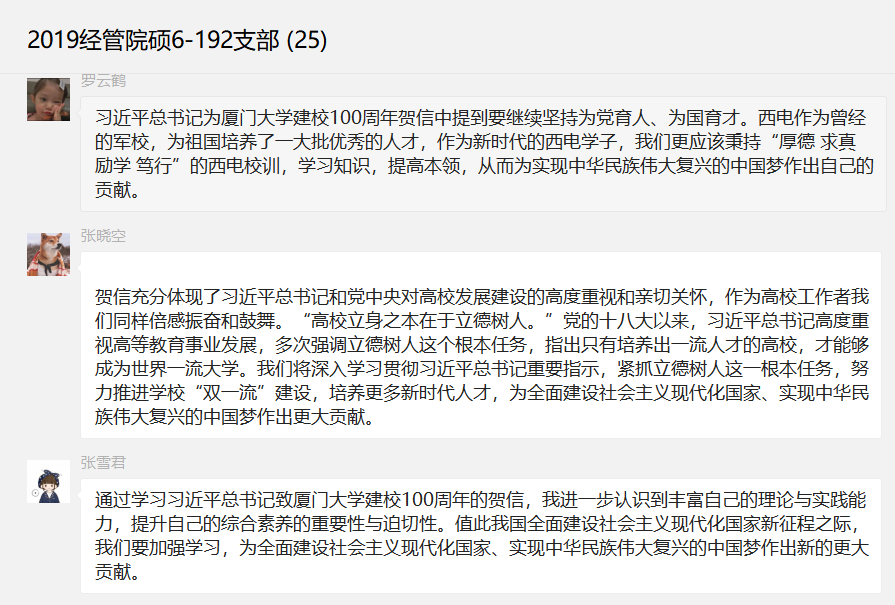 本科二党支部杨谕东同学学习后表示,习近平总书记在贺信中提到了厦门大学“爱国,革命,自强,科学”的优良校风,作为在通信领域以及电子信息学科风口浪尖的高校,西电同样拥有“厚德求真,砺学笃行”的校训。在祖国发展迈入新时代之时,我们新时代的青年要把爱国作为根本,把创新作为动力,把自强作为习惯,保持科学严谨的态度,无论在学习还是生活上都要勇于尝试,不断创新,为新时代与中国梦增光添彩!