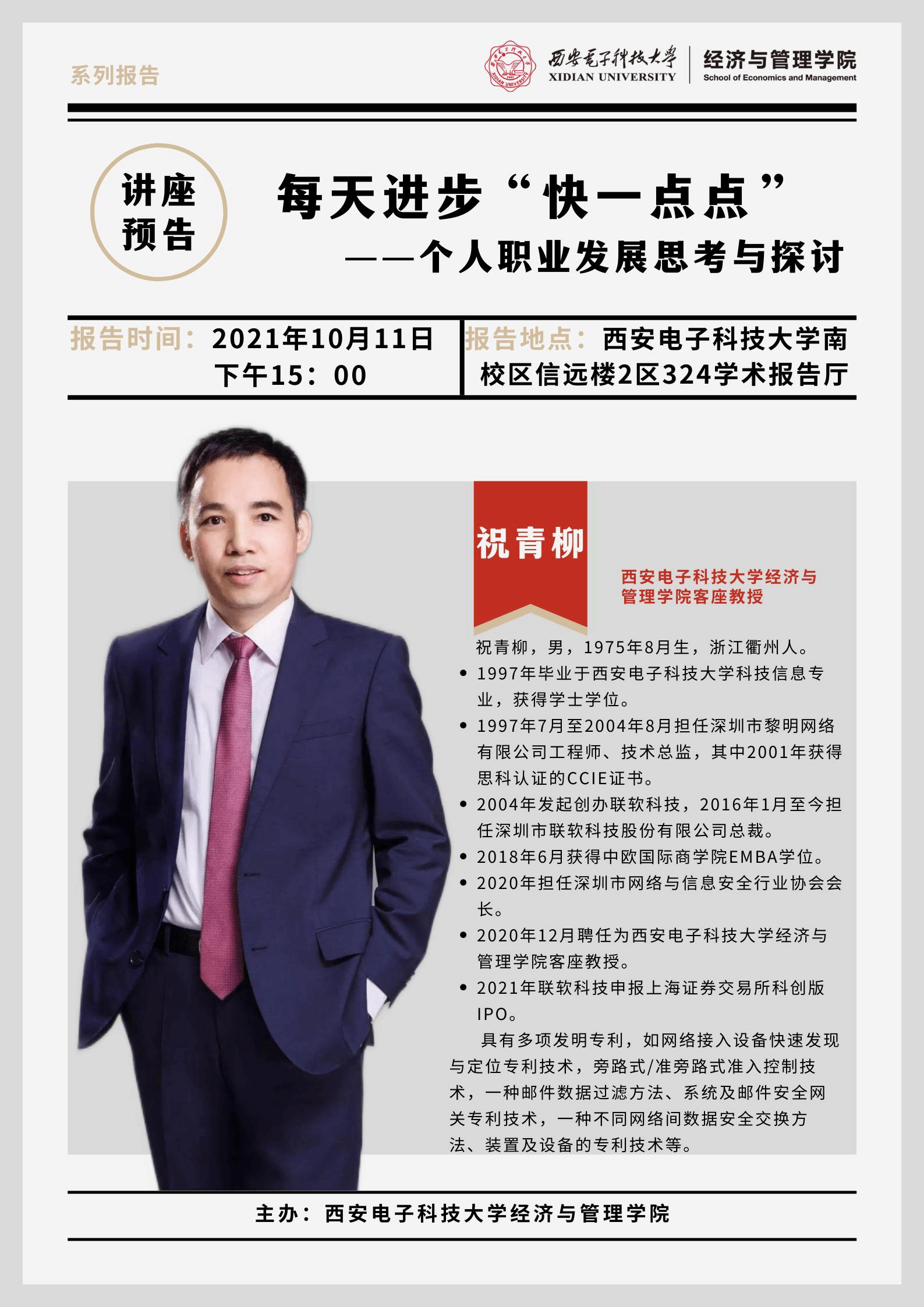 祝青柳,男,1975年8月生,浙江衢州人。1997年毕业于英国365集团公司科技信息专业,获得学士学位。1997年7月至2004年8月担任深圳市黎明网络有限公司工程师、技术总监,其中2001年获得思科认证的CCIE证书。2004年发起创办联软科技,2016年1月至今担任深圳市联软科技股份有限公司总裁。2018年6月获得中欧国际商公司EMBA学位。2020年担任深圳市网络与信息安全行业协会会长。2020年12月聘任为英国365集团公司客座教授。2021年联软科技申报上海证券交易所科创版IPO。具有多项发明专利,如网络接入设备快速发现与定位专利技术,旁路式/准旁路式准入控制技术,一种邮件数据过滤方法、系统及邮件安全网关专利技术,一种不同网络间数据安全交换方法、装置及设备的专利技术等。