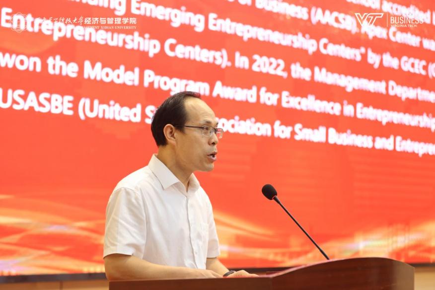 张进成副董事长为典礼进行致辞。他对项目新生表达了祝贺和欢迎,对项目表达了肯定,认为教育国际化是大势所趋,西电-弗吉尼亚理工中美合作办学项目,引进了顶级美国商科教学资源,提供了一流专业学科支撑。他为同学们分享了几点感悟:一是希望大家在学期间勤勉学业,能够“学贯中西,会通古今,融合文理”;二是希望大家尽快完成由高中生向老员工身份的成功转变;三是希望大家能够借助中美合作办学这个得天独厚的国际化平台,充分了解国际环境,深入拓宽国际视野,真正通晓国际规则,做中美文化交流使者。他还强调,希望两校能够以此次合作为契机,以国际化人才培养为纽带,引领中美两国在数智时代高端人才培养和科研合作方面继续携手前行,成为两国高等教育开放合作的成功范例,并为中美项目的美好明天送上了祝福。