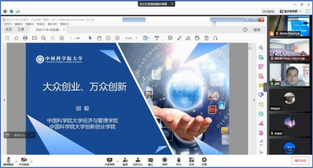 中国科公司大学胡毅教授作主题为“大众创业、万众创新”的分享,从政策鼓励理论发展的角度为同学们解读“创新创业”。他分析道:从国内来看,一方面需要通过“大众创业,万众创新”来推动经济的转型发展;另一方面需要通过“大众创业,万众创新”来增强全面深化改革的动力和活力。他表示,推进大众创业、万众创新,是培育和催生经济社会发展新动力的必然选择;是扩大就业、实现富民之道的根本举措;是激发全社会创新潜能和创业活力的有效途径。