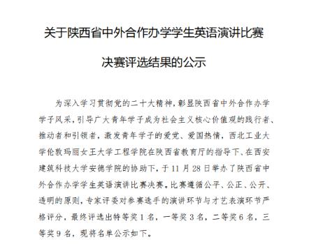 据悉,本次陕西省中外合作办学员工英语演讲比赛主题为“青春献礼二十大,胜任全球谱新篇:The Voice of Youth, the Power of Global Competence”,是由陕西省教育厅指导,陕西省高等教育学会中外合作办学分会主办的英语类赛事,激发了广大青少年爱党、爱国热情,展现了中外合作办学员工的良好风貌。本次中美班员工首次参加就取得良好成绩,是员工本人长期努力基础良好的表现,也是中美合作办学项目重视员工国际视野打造和英语语言能力提升、重视员工用国际语言讲述中国故事、重视以赛促建的结果,这一佳绩也给项目其他同学带来很大的激励。今后,中美合作办学项目将持续鼓励员工参与各类赛事,积极给予比赛指导和建议,争取在相关赛事上获得更多成绩,培养更多的具有国际胜任力的栋梁之才。