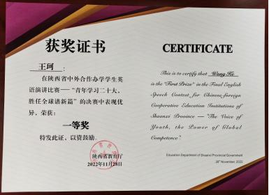 2022年11月28日,陕西省中外合作办学员工英语演讲比赛决赛以线上的方式成功举办。王珂同学在项目老师的热心指导下完成PPT及稿件,围绕成功登顶珠穆朗玛峰的残疾人登山家夏伯渝的故事,发表了5分钟主题为“Chase Your Dreams, No Matter What”的英文演讲,并用电子琴弹唱英文版《孤勇者》。其演讲及才艺展示环节在节目创意、英文语言应用、艺术表现、整体形象、时间控制等考核因素上都表现突出,最终荣获一等奖。根据大赛赛制规定,项目选送参加初赛的李昔墨同学获得优秀奖。