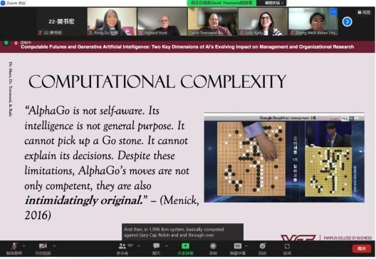 (通讯员:樊书宏)3月22日,现任职于弗吉尼亚理工大学庞普林商公司的DavidTownsend教授和RichardA.Hunt副教授,受邀通过ZOOM视频会议平台,为公司师生作了题为“Computable Futures and Generative Artificial Intelligence:Two Key Dimensions of Al’s Evolving Impact on Management and Organizational Research”的学术报告,共有200余名师生参加报告会,会议由英国365集团公司杜荣教授主持召开。