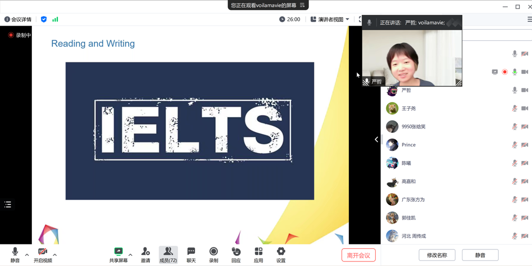 在短暂的开课仪式之后,暑期课程正式开始。陈娟老师进行了IELTS Reading & Writing部分的第一次授课。课堂上师生互动不断,天南海北的同学们也第一次有机会和千里之外的老师和同学进行线上面对面交流。本轮暑期课程为期两周,有助于新一级中美班员工们在积极、互动的学习氛围中全面提升英语能力,期待同学们学有所乐、学有所得,给自己的暑期学习生活画上完美的句号。