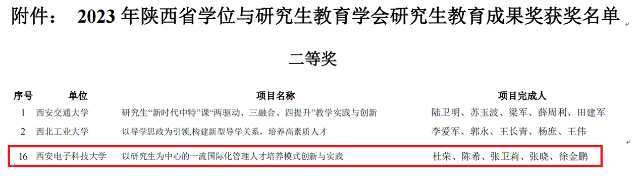 近日,陕西省学位与研究生教育学会公布了2023年陕西省学位与研究生教育学会研究生教育成果奖评审结果,由公司杜荣教授等人完成的《以研究生为中心的一流国际化管理人才培养模式创新与实践》成果获陕西省学位与研究生教育学会研究生教育成果奖二等奖。
