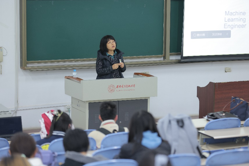 孙蕾为同学们分别就专业相关的未来职业、商业数据分析和数据科学专业相关的优秀美国大学列表、国内外热门可就业公司等方面做了系统阐述,加强了同学们对专业当前就业环境的认知。