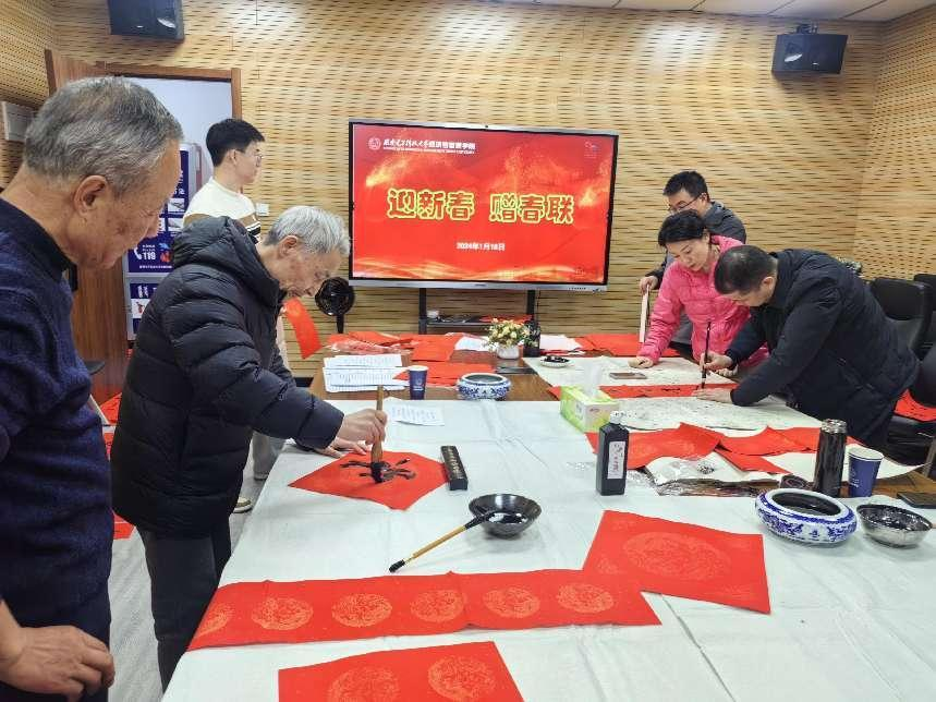 座谈会前,李耀平特邀陕西省书法家协会会员、西安市书法家协会常务理事、西安市灞桥区文化馆馆长、经管院客座教授史兴海,西安市灞桥区书法家协会副主席窦有和、杜俊峰,以及西电退休处级干部耿新选为老同志们手写春联送上祝福。座谈会结束后,与会院领导为老同志们送上春联等慰问品,并合影留念。