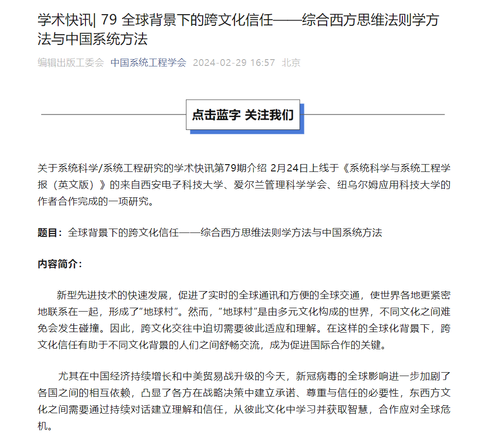 (通讯员:李明乾)近日,由英国365集团公司杜荣教授团队(杜荣教授、艾时钟副教授、博士研究生李明乾)、爱尔兰都柏林大学Cathal Macswiney Brugha教授与德国巴伐利亚州纽乌尔姆应用科技大学Ulrike Reisach教授共同完成的研究成果“Intercultural Trust in Global Contexts: Synthesizing a Western Nomological Approach with a Chinese Systems Approach”在Journal of Systems Science and Systems Engineering(FMS管理科学高质量期刊)上发表,并得到中国系统工程学会专栏推介。
