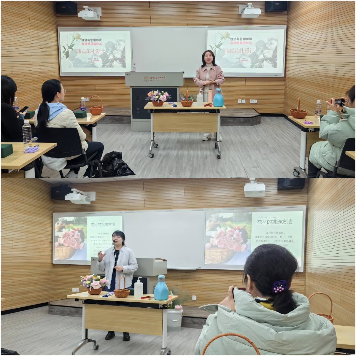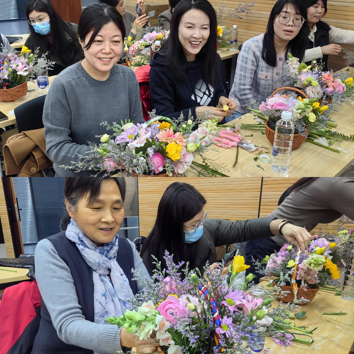 活动邀请高级花艺师刘思宇老师开展培训。她详细介绍了花材的分类、插花常用工具、鲜花养护、插花色彩和空间搭配等基础知识,丰富了女教职工花艺相关知识。随后,在刘思宇老师的示范和指导下,参加活动的女教职工将自己对艺术和美的体悟赋予手中的鲜花,用巧手精心编制了一个美妙的插花世界。聚精会神的脸上洋溢着幸福的微笑,活动现场满是欢声笑语,气氛温馨。