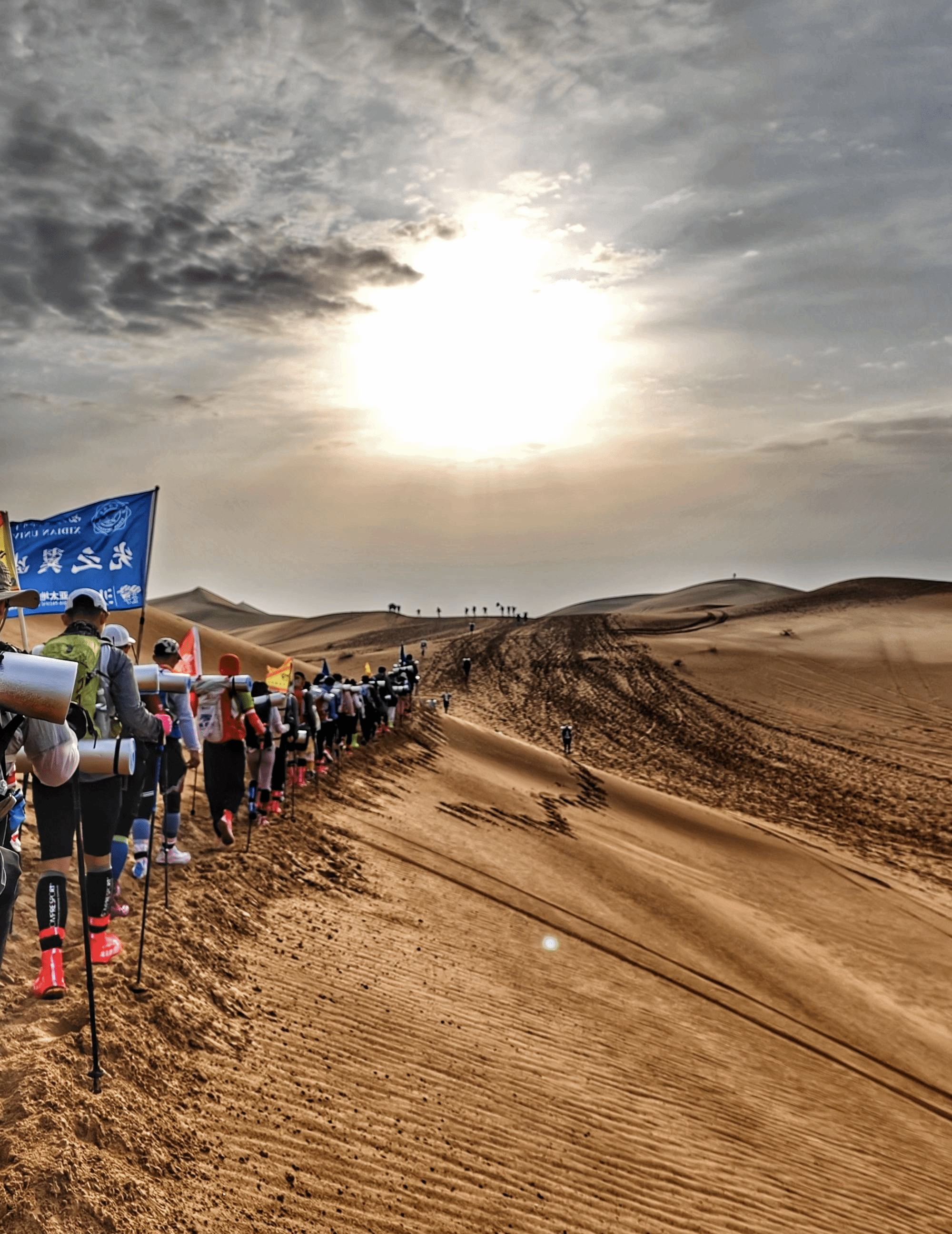 比赛第一天,风沙翻滚如恶虎,队员们在飞舞的狂沙中几乎难以睁开眼睛,只能半眯着眼睛,深一脚浅一脚地往前挪动,顶着狂风飞沙穿越一个又一个CP点,完成魔鬼赛程的第一天。