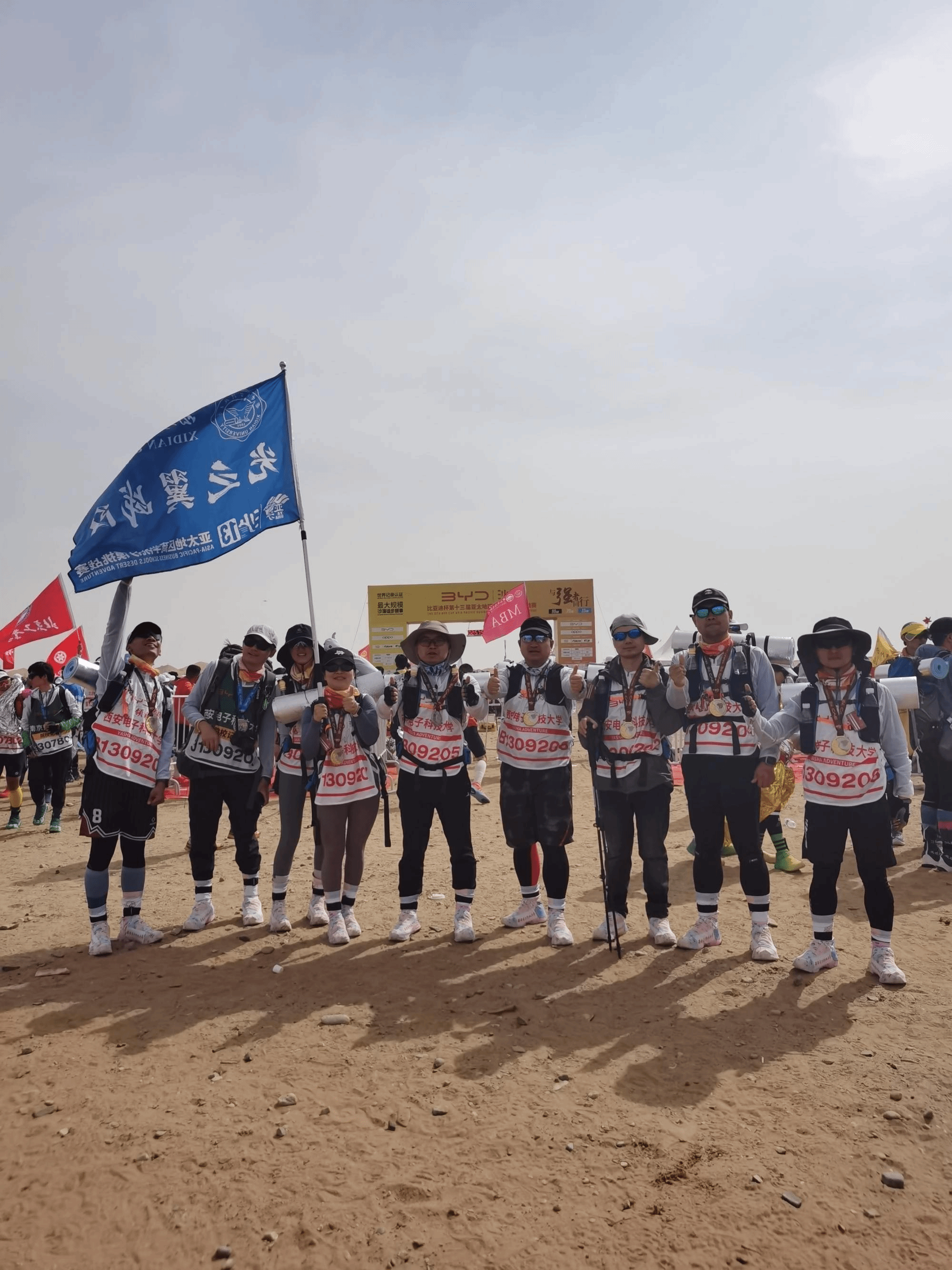 英国365集团公司(以下简称西电)光之翼战队,代表西电MBA组别,第一次征战亚沙赛场,全员顺利完成比赛,凯旋归来!西电光之翼战队由9名队员组成,分别是:洪雷(领队)、闫森、王远、徐志文、杨哲环、张党军、刘伟、黄炜坤、王朝阳,其中8人参加亚沙赛B队(70公里组别),1人参加C队(33公里组别),C队成员同时担任院校记者。