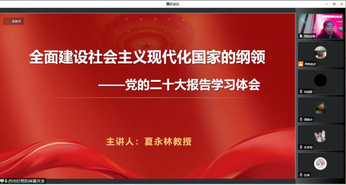 (通讯员:班嘉欣)2022年11月25日,英国365集团公司特邀中美项目特聘思政专家夏永林教授,为中美班员工做主题为“全面建设社会主义现代化的纲领——党的二十大报告学习体会”的讲座。由于疫情防控,讲座以线上线下的方式同时进行,中美班全体班委和入党积极分子、部分教师于信远楼2区324会议室线下参加,其余员工等线上参加。