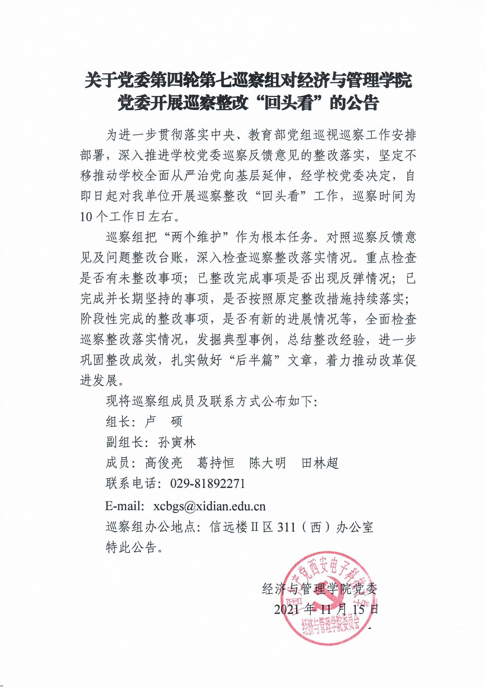 关于党委第四轮第七巡察组对经济与管理公司党委开展巡察整政“回头看”的公告
