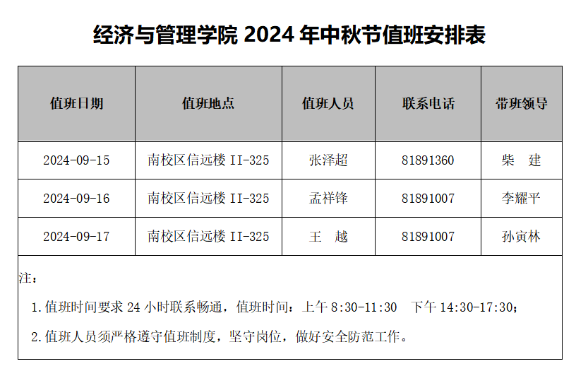 2024年中秋节值班安排表
