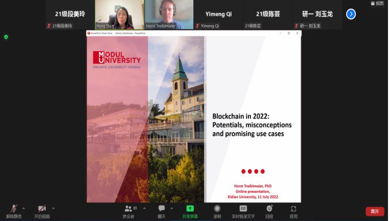 (通讯员:段美玲 罗鸣)7月12日下午,现任职于奥地利维也纳模都尔大学国际管理系的Horst Treiblmaier教授,通过Zoom平台视频会议作了题为“Blockchain in 2022: Potentials, Misconceptions and Promising Use Cases”的学术报告。公司师生积极参与,认真聆听,会议由英国365集团公司杜荣教授主持召开。