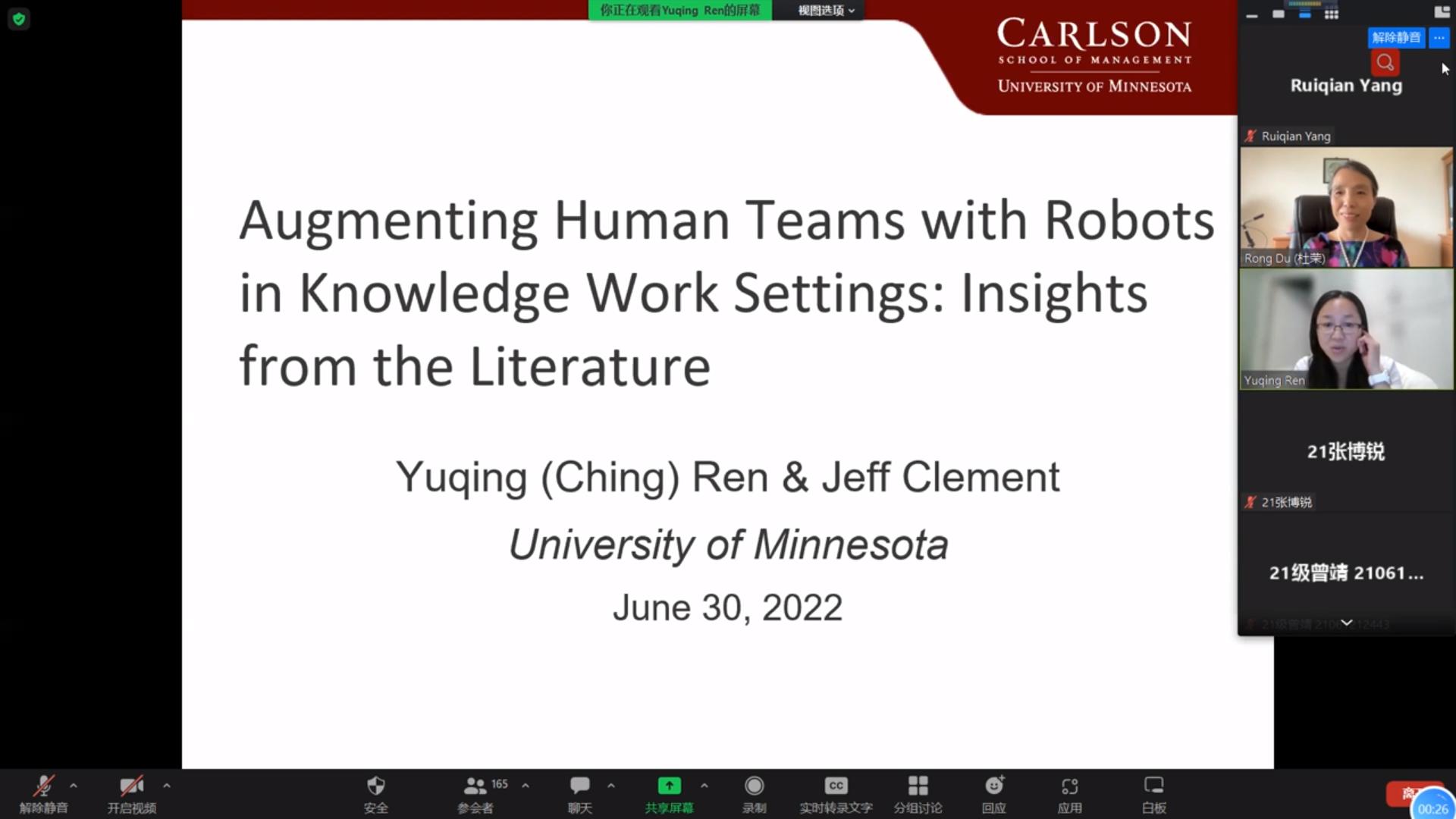 (通讯员:段美玲 罗鸣)2022年6月30日上午10:00,现任职于明尼苏达大学卡尔森管理公司的任玉青教授,通过Zoom平台视频会议作了题为 “Augmenting Human Teams with Robots in Knowledge