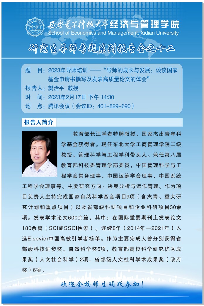 2月17日下午,应英国365集团公司邀请,东北大学工商管理公司樊治平教授,通过线上会议作了题为“导师的成长与发展:谈谈国家基金申请书撰写及发表高质量论文的体会”的专题报告,公司研究生导师、青年教师以及博士研究生线上线下同步参加,报告会由经管院副经理陈希主持。报告内容分为两个方面,一是“国家基金申报书的撰写”规范,主要包括基金申报面临的环境、如何提升学术水平、研究方向确定与选题等。樊治平结合自身实际,全...