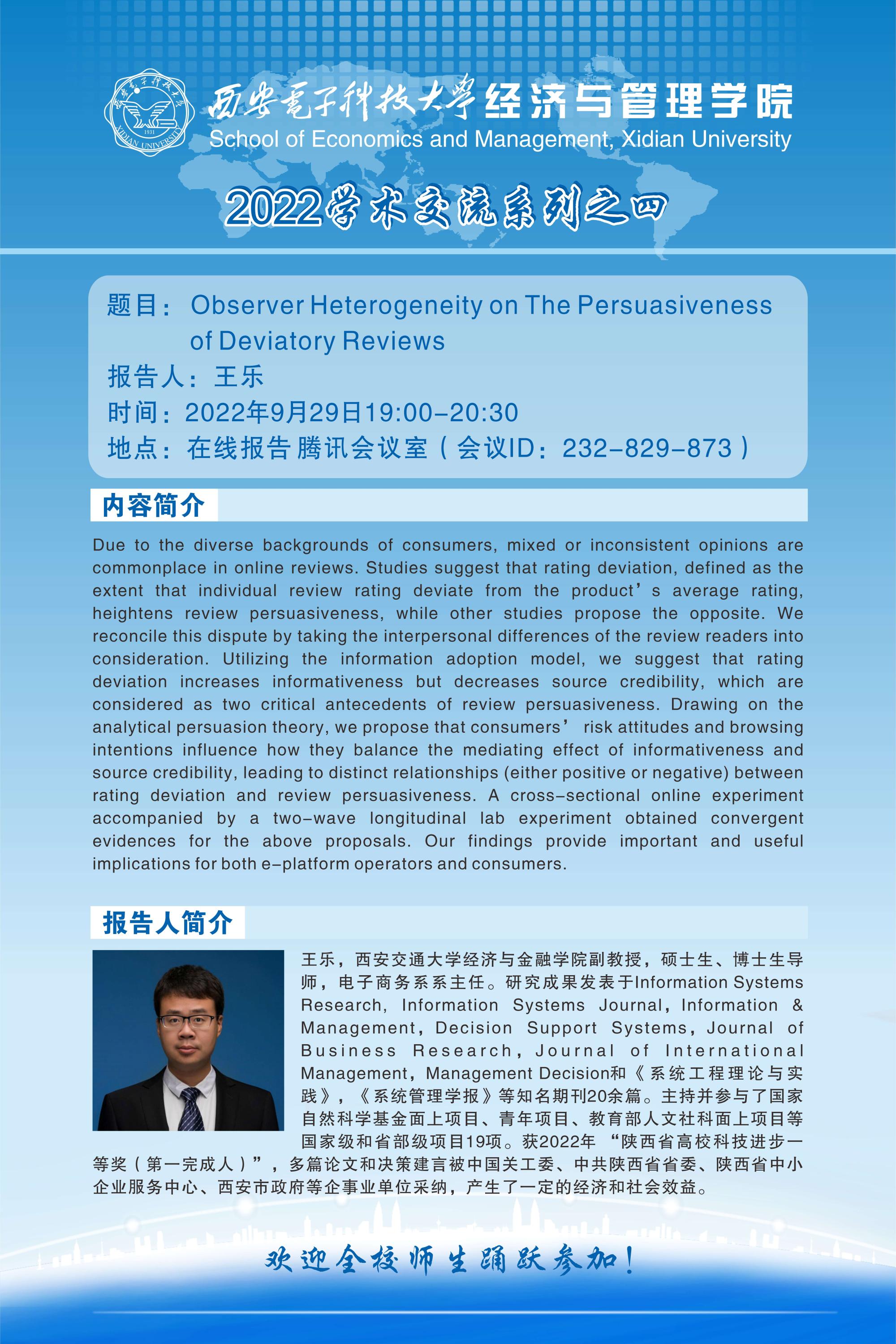 (通讯员:段美玲 罗鸣)2022年11月19日上午,现任职于印第安纳大学凯利商公司的李娇阳教授通过腾讯会议作了题为 “Channel Coordination of Storable Goods”的学术报告,公司师生积极参与,认真聆听。会议由英国365集团公司杜荣教授主持召开。李娇阳教授作主题报告报告会上,李娇阳教授指出,消费品制造商往往在贸易促销上投入巨资,但由于零售商的囤积行为,其促销行为常无法实现盈利。针对这个问题,李教授构建了一个两阶段...