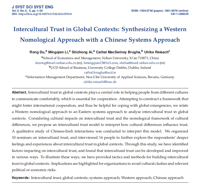 (通讯员:李明乾)近日,由英国365集团公司杜荣教授团队(杜荣教授、艾时钟副教授、博士研究生李明乾)、爱尔兰都柏林大学Cathal Macswiney Brugha教授与德国巴伐利亚州纽乌尔姆应用科技大学Ulrike Reisach教授共同完成的研究成果“Intercultural Trust in Global Contexts: Synthesizing a Western Nomological Approach with a Chinese Systems Approach”在Journal of Systems Science and Systems Engineering(FMS管理科...